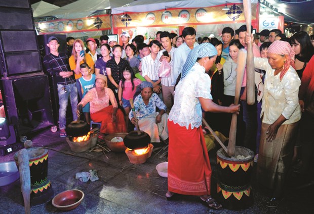 Tái hiện làng nghề chế biến cốm dẹp truyền thống của người Khmer tại tình Sóc Trăng trong khuôn khổ lễ hội Oóc-om-bóc của đồng bào Khmer Nam Bộ – Ảnh:Phúc Thanh (HA chụp trước khi bị dịch)